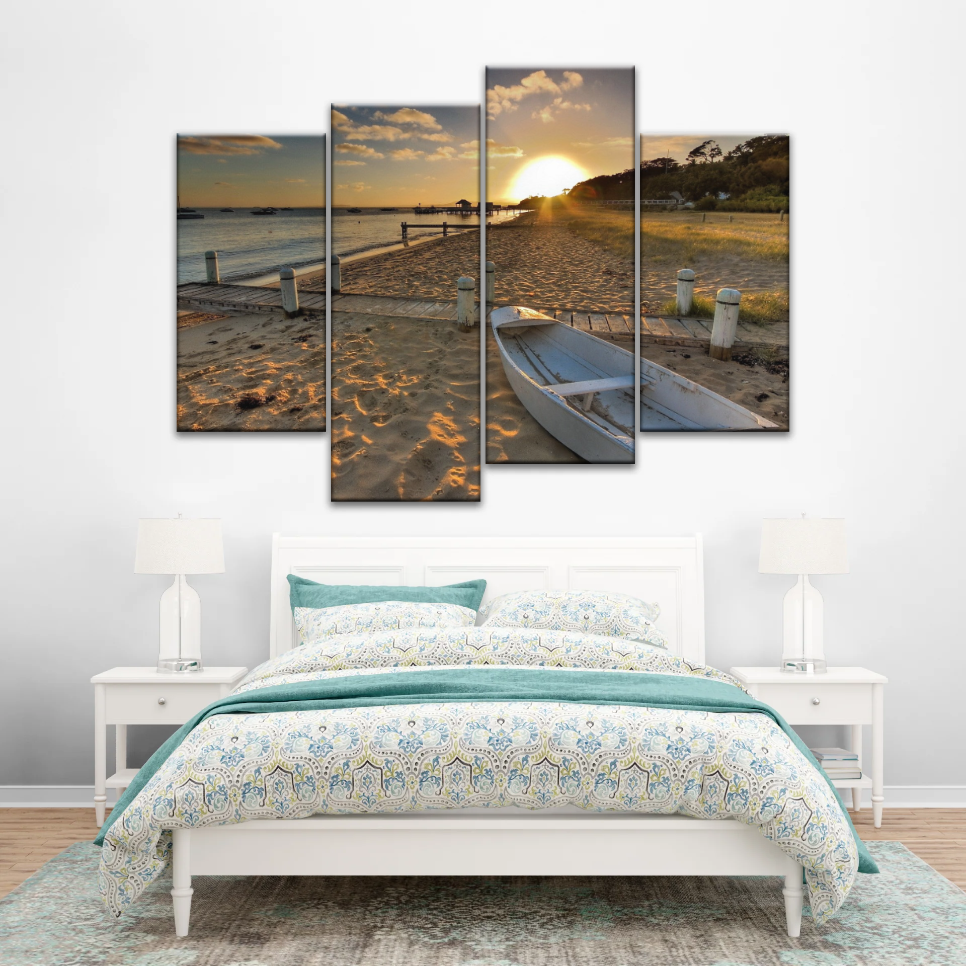 A coastal evening as boats gently sway against the warm hues of the setting sun. This artwork captures the essence of seaside serenity, bringing the beauty of a beach sunset and the charm of docked boats into your living space.