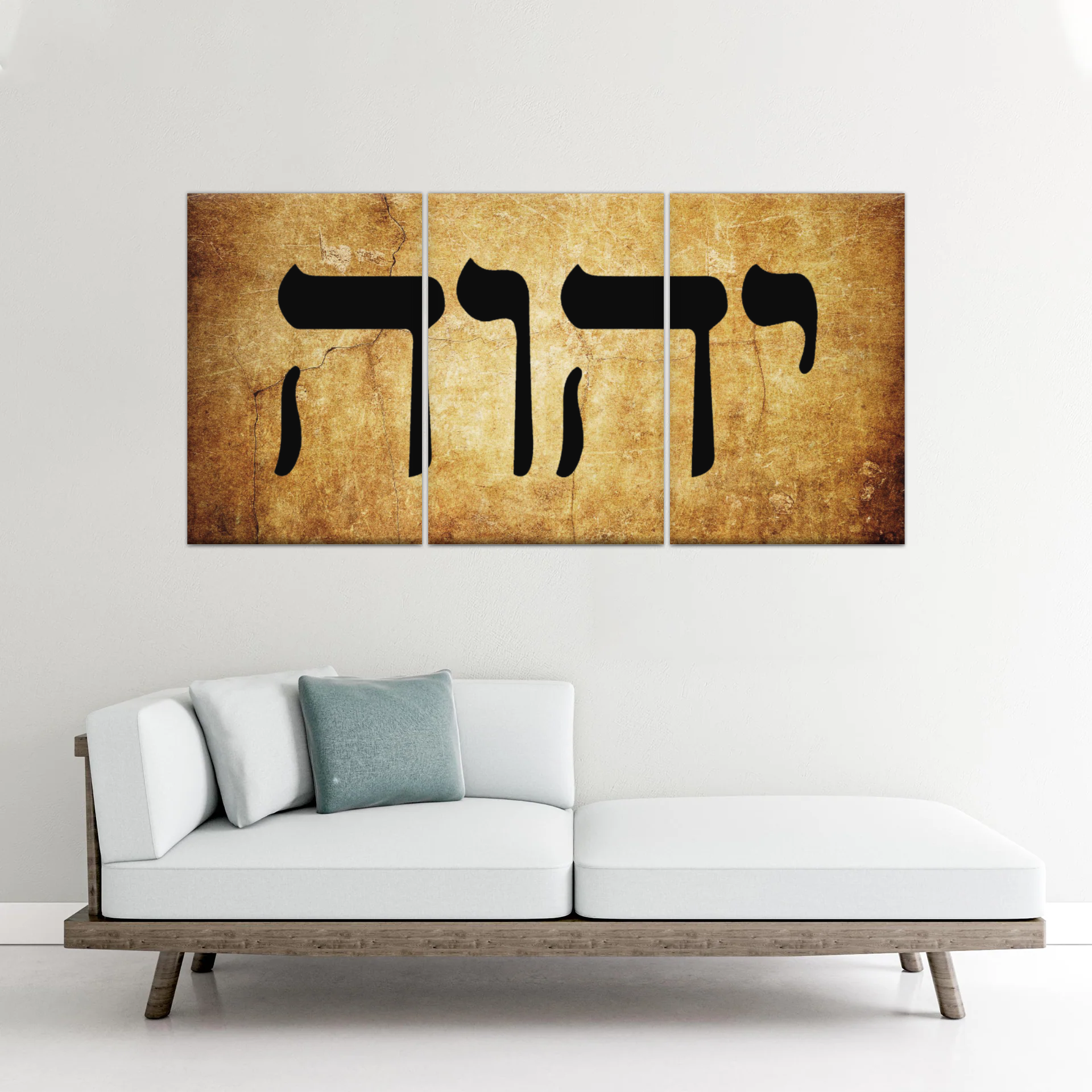 In an exquisite display of artistry, this magnificent creation elegantly presents the hallowed Hebrew appellation of the God, Yahweh. This canvas portrayal not only imparts a sense of spirituality to your living space but also stands as a perpetual emblem of the profound import of Yahweh within the Hebrew heritage.