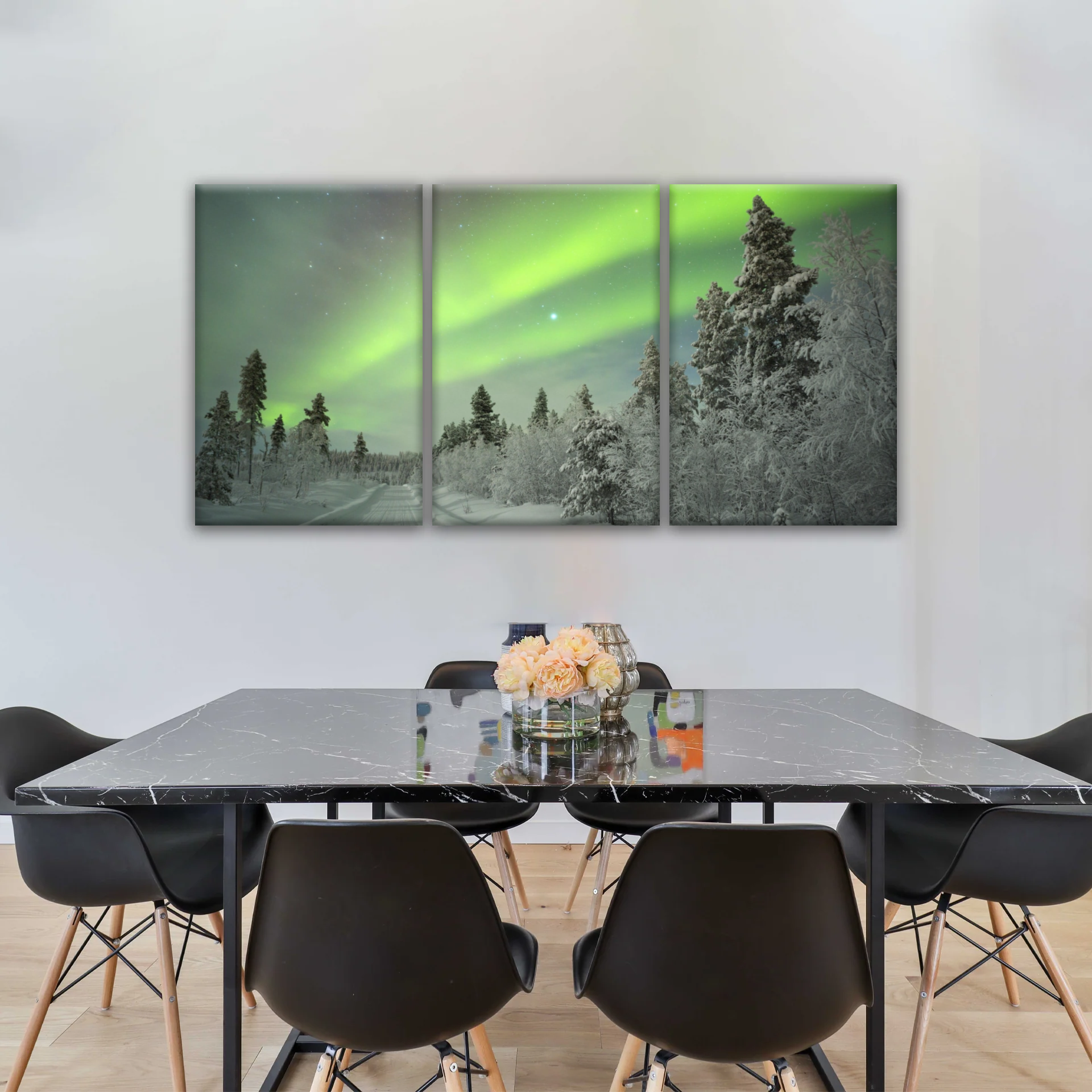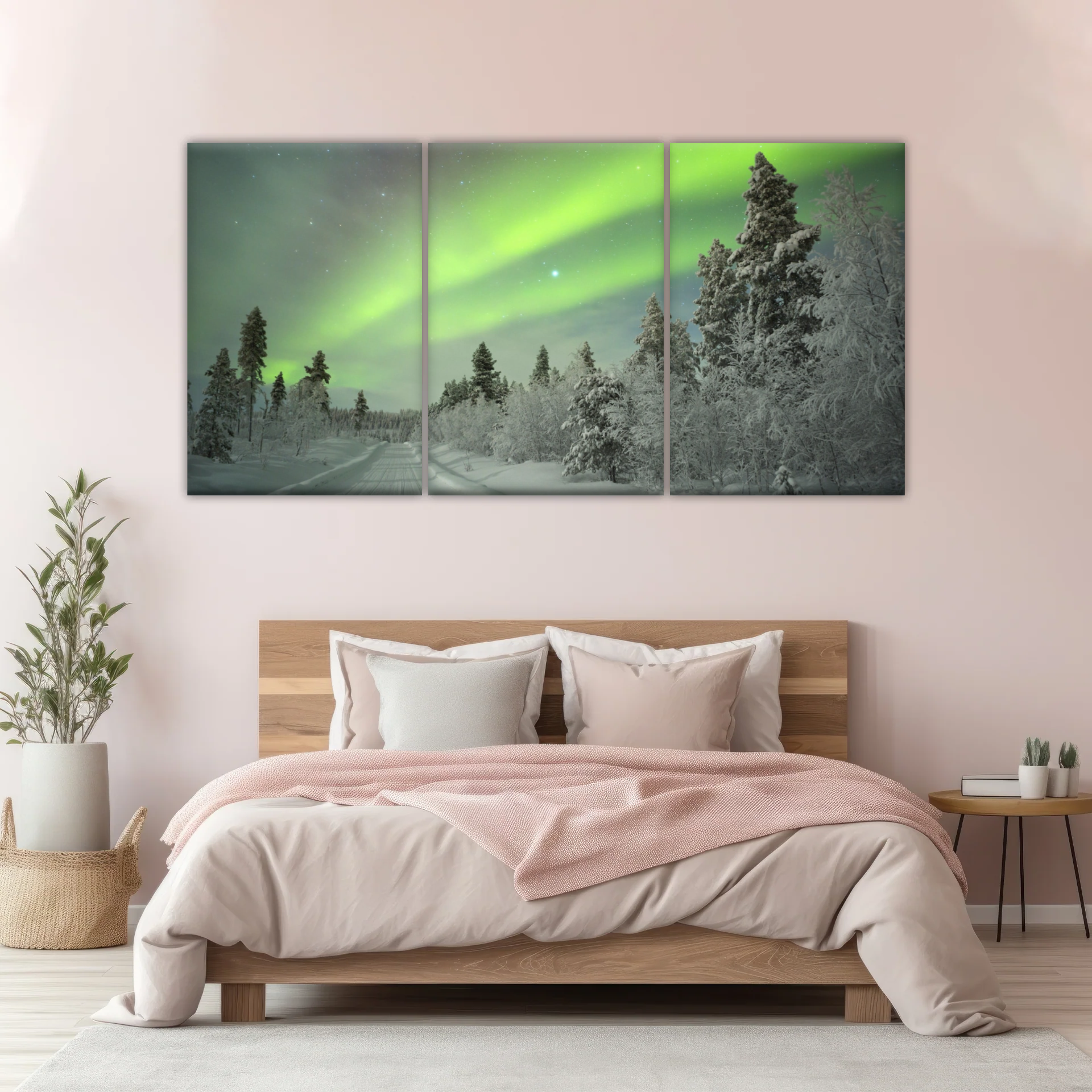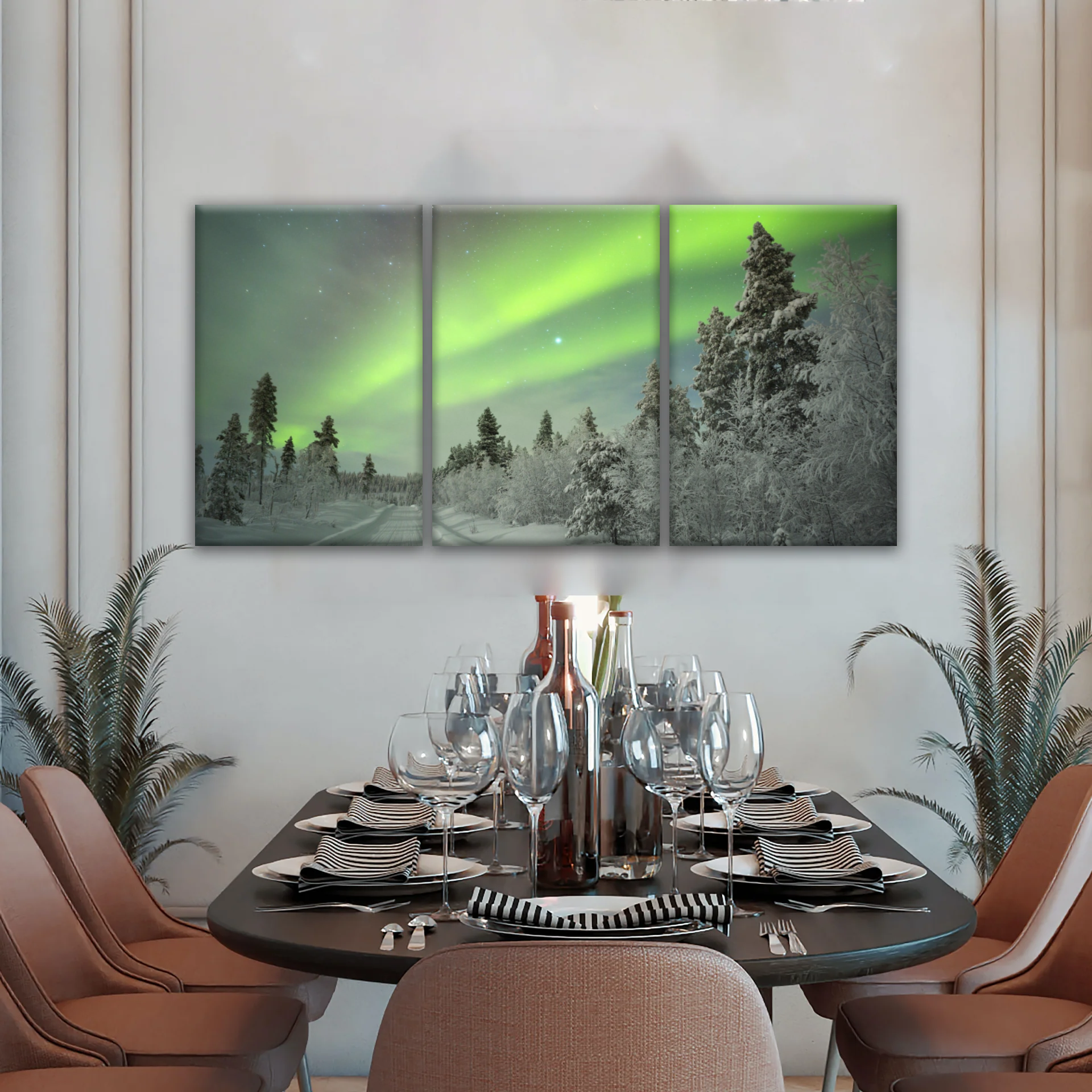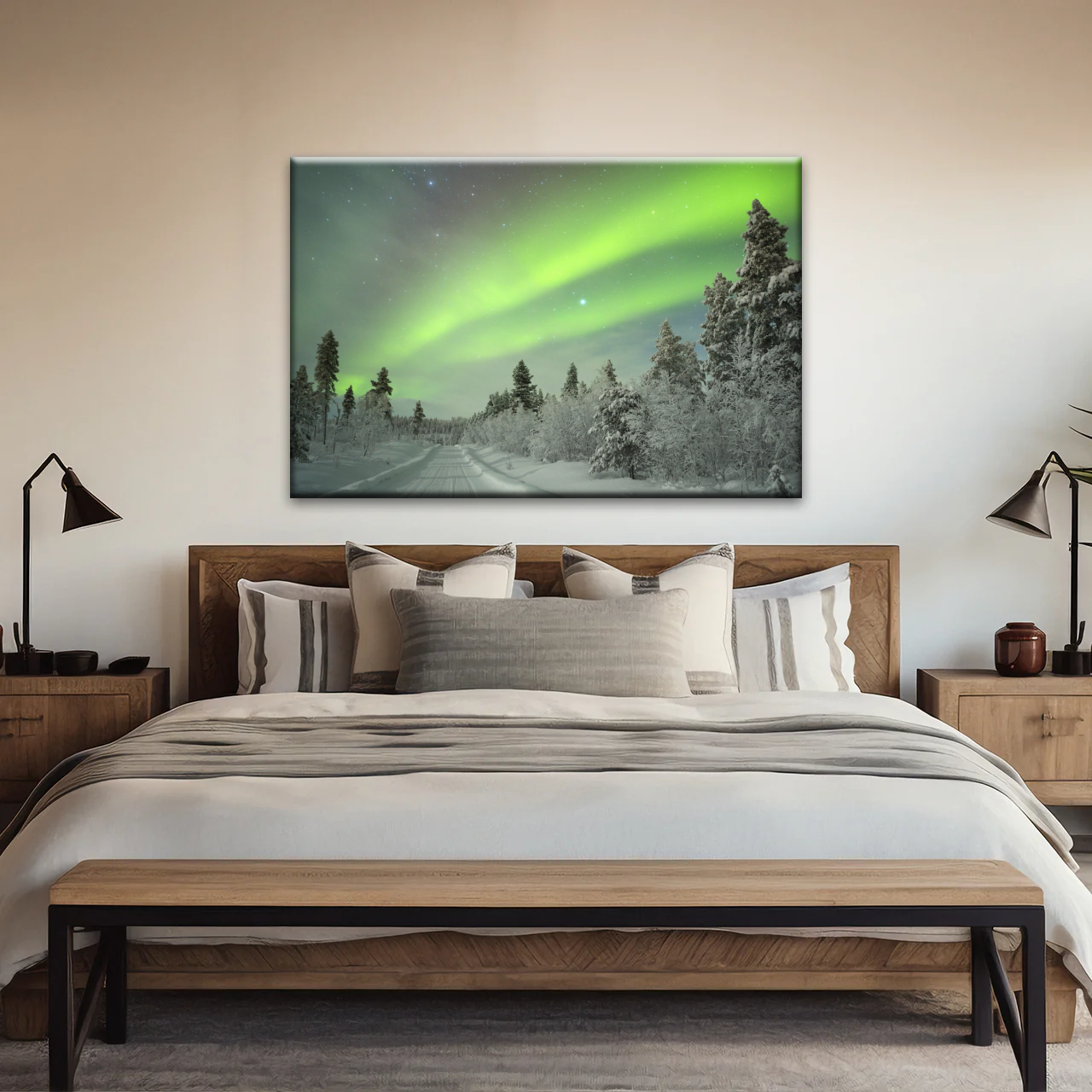 Witness the ethereal dance of shimmering green lights against a backdrop of icy winter landscapes, evoking a sense of wonder and magic. Bring the stunning allure of the Northern Lights into your home with this mesmerizing artwork.