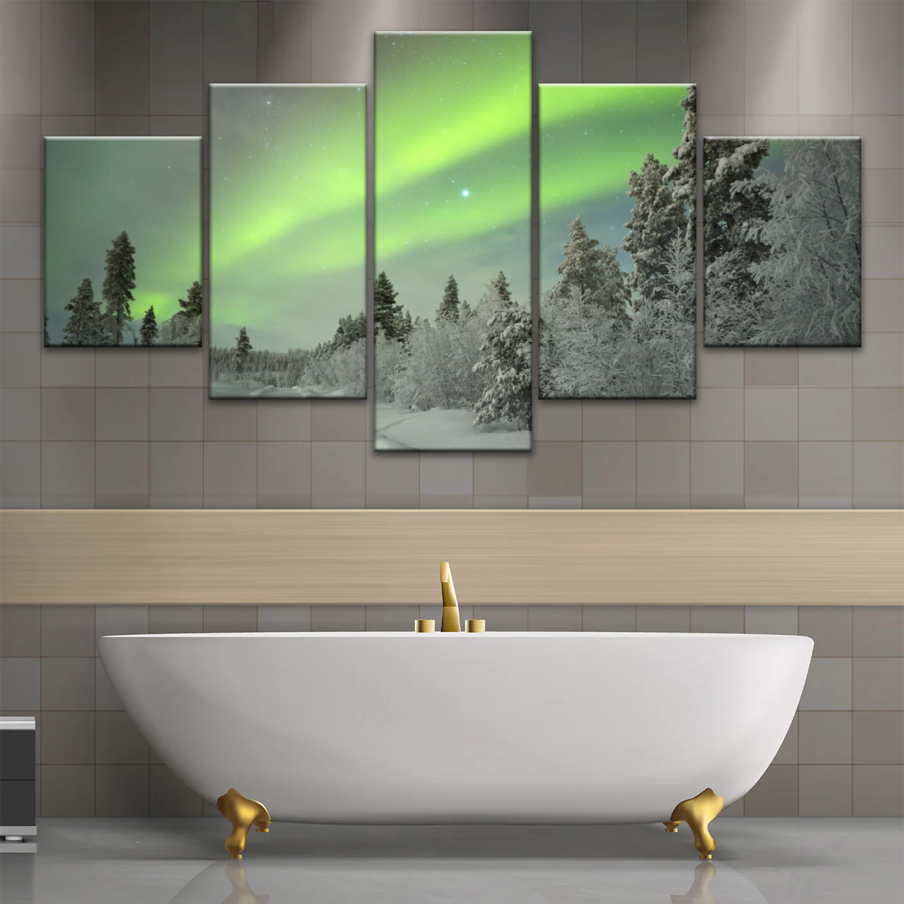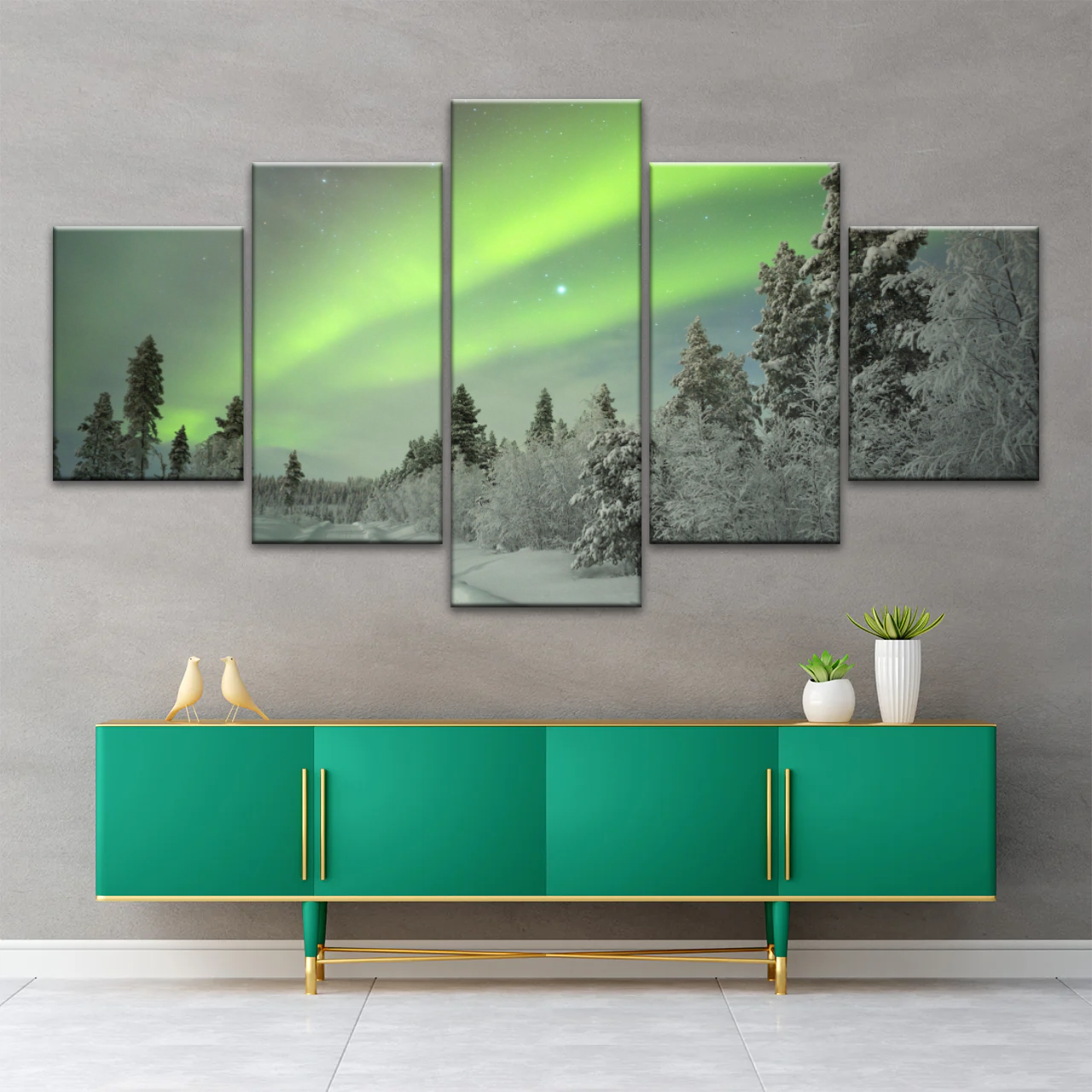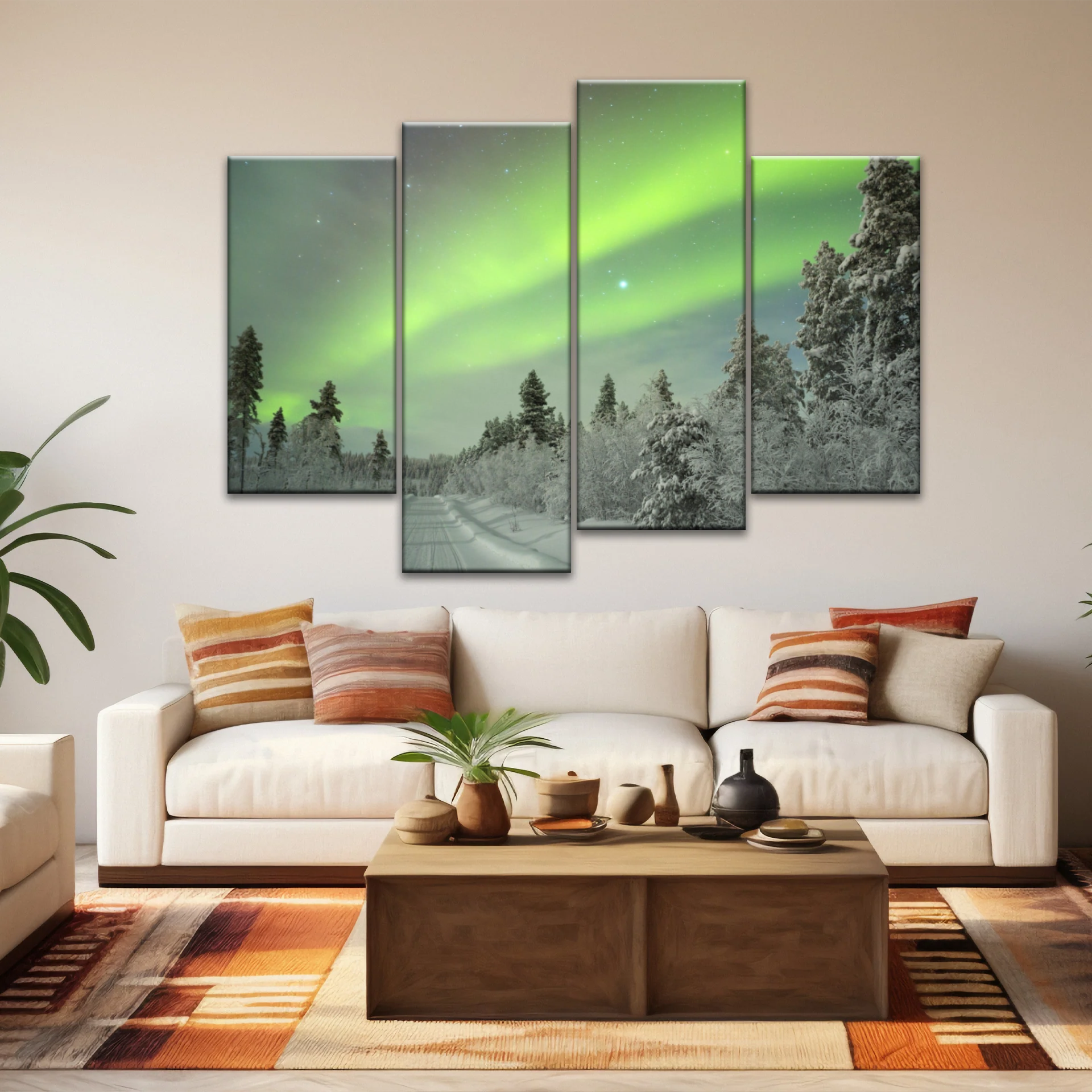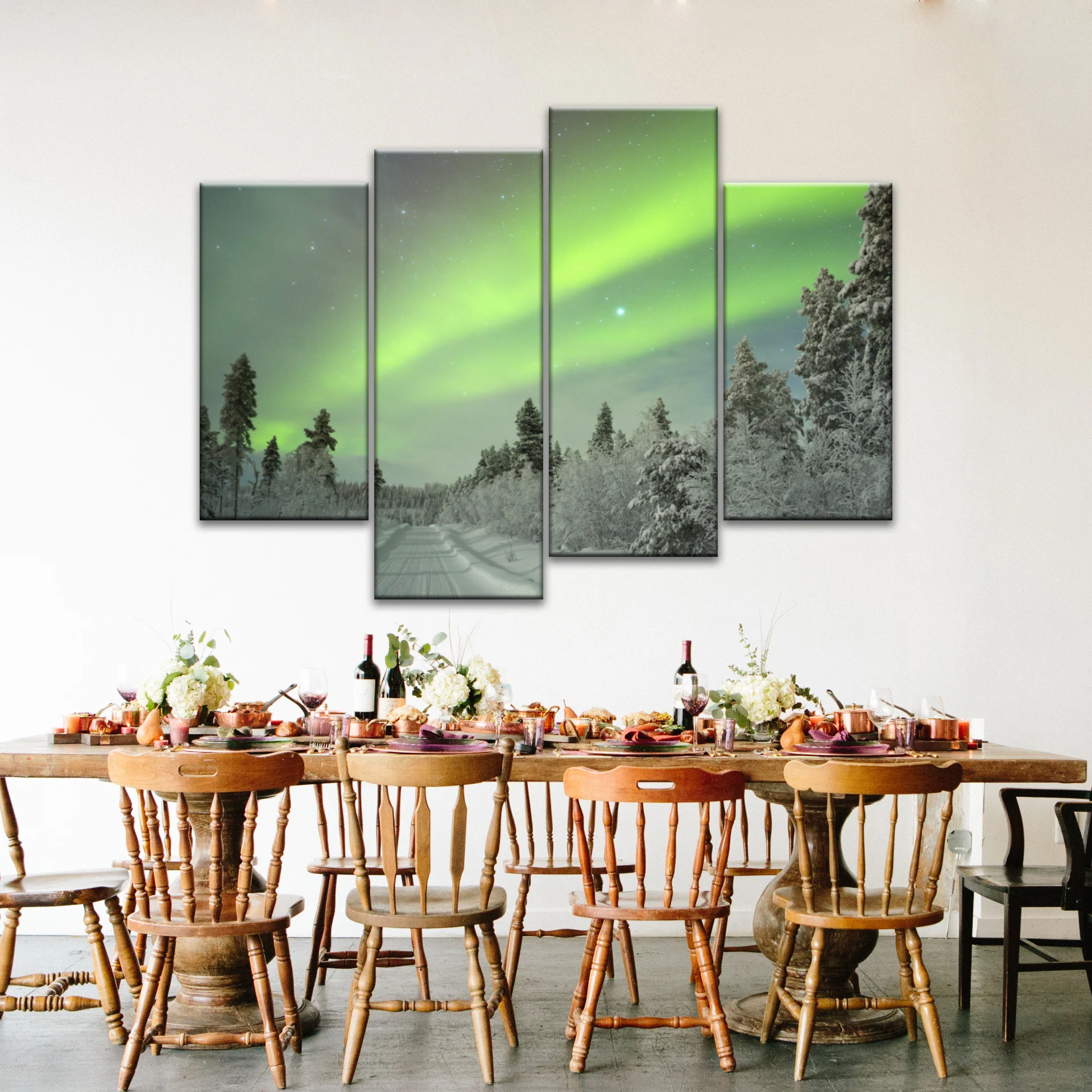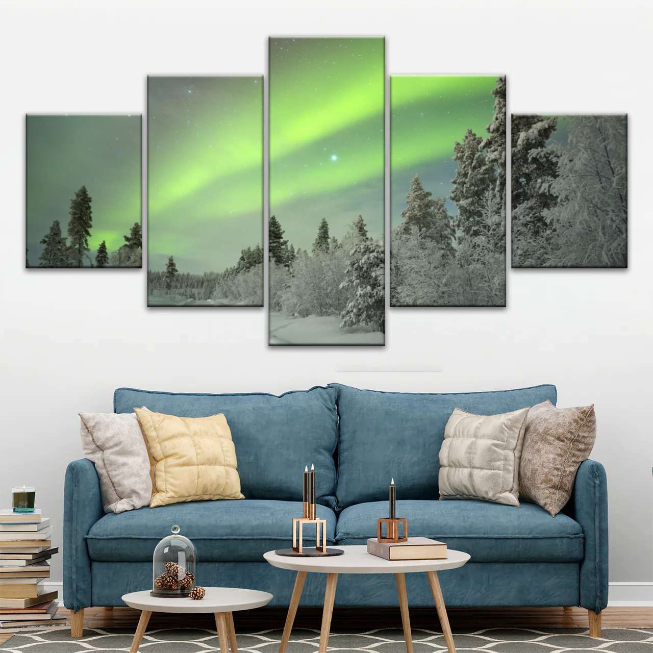 Witness the ethereal dance of shimmering green lights against a backdrop of icy winter landscapes, evoking a sense of wonder and magic. Bring the stunning allure of the Northern Lights into your home with this mesmerizing artwork.