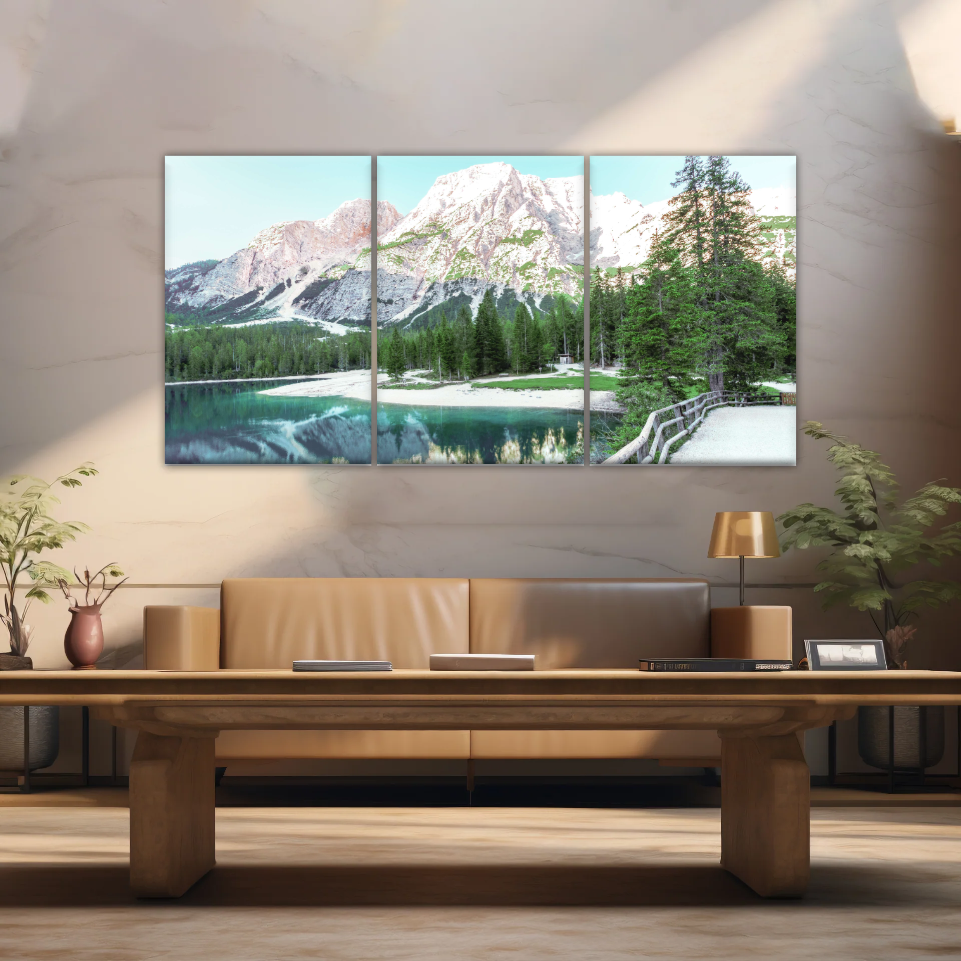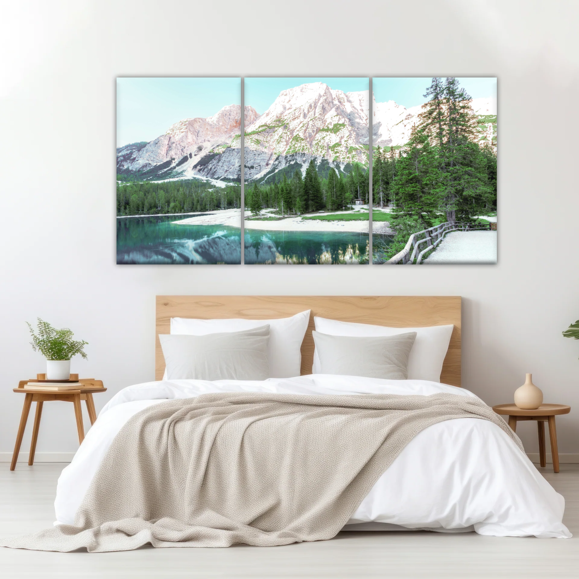 This wall art showcase a tranquil scene of snow-capped mountains, a glistening lake and lush coniferous trees. The high-quality print captures the intricate details and vibrant colors, making it a striking focal point for any room decor.
