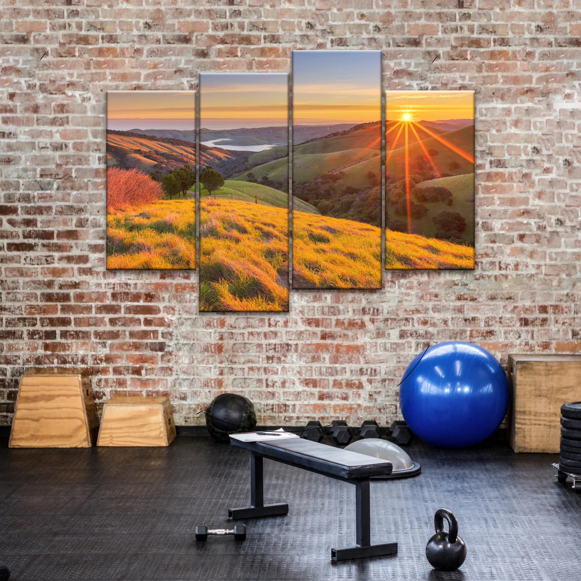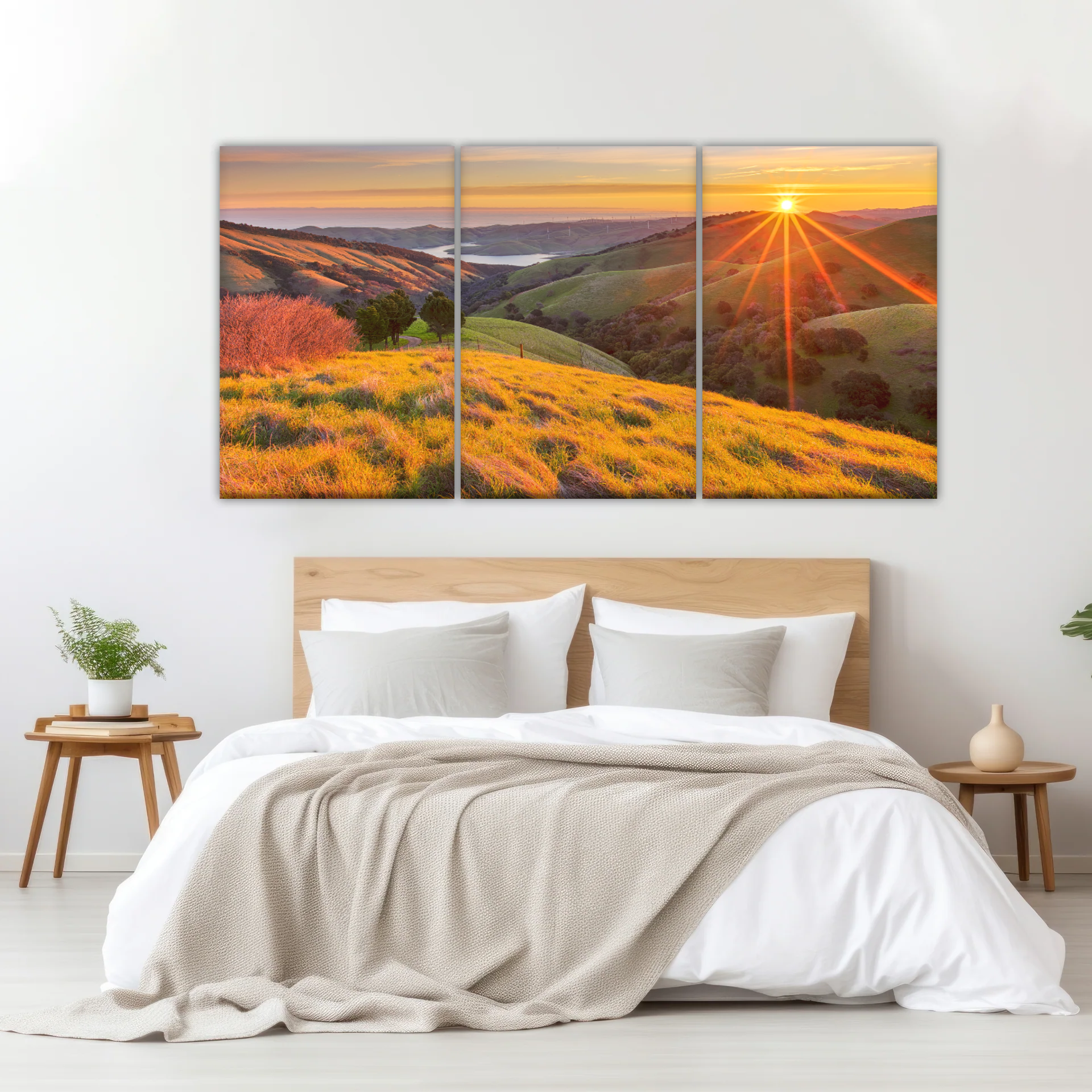 Enveloped in the soft glow of the morning sun, this stunning landscape captures the serene majesty of a mountain bathed in the warm hues of sunrise, brings a sense of tranquility and wonder to any room.