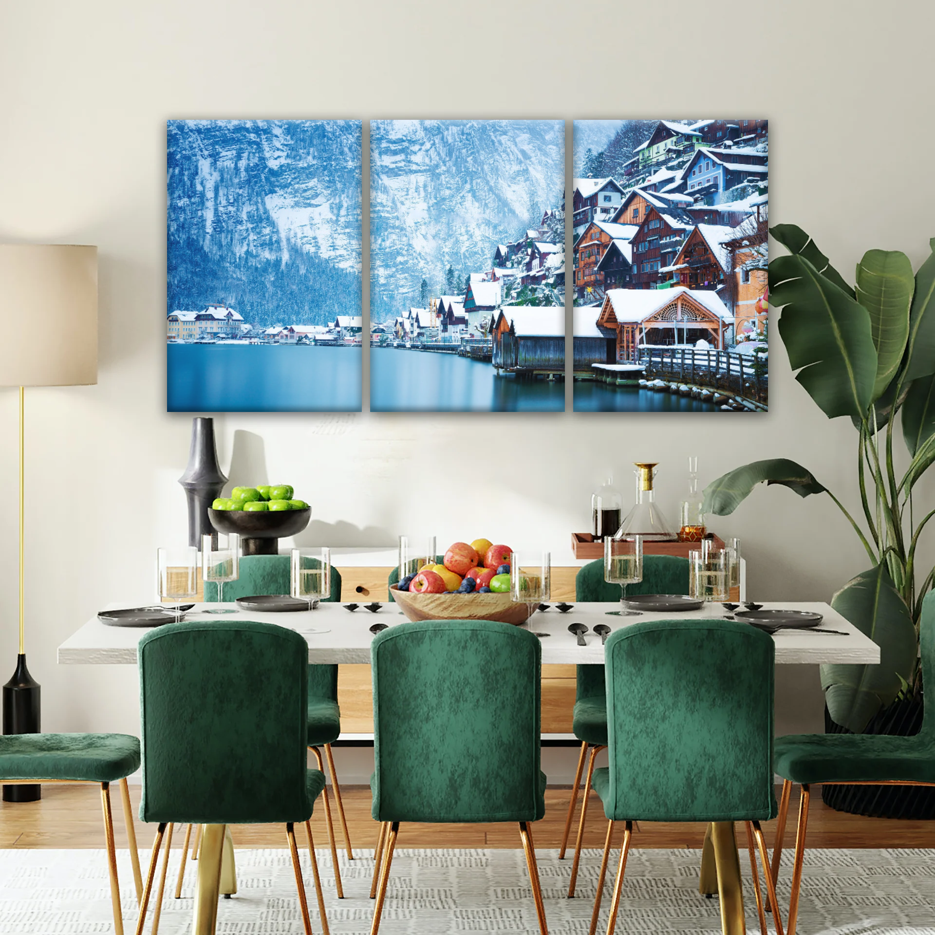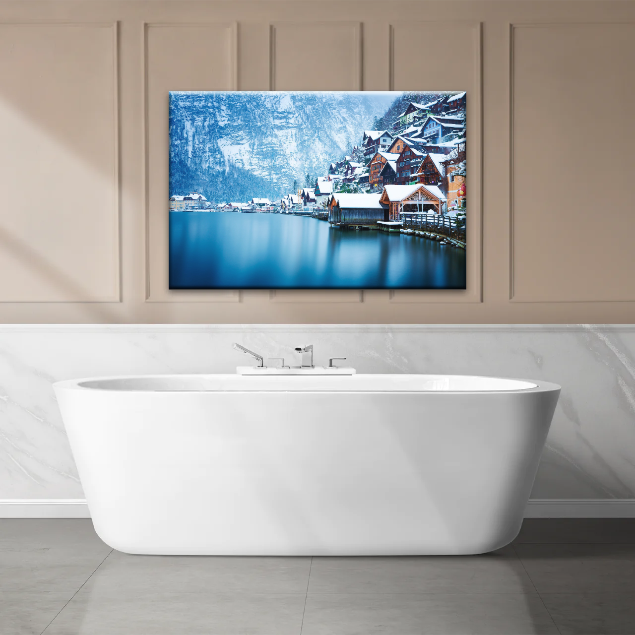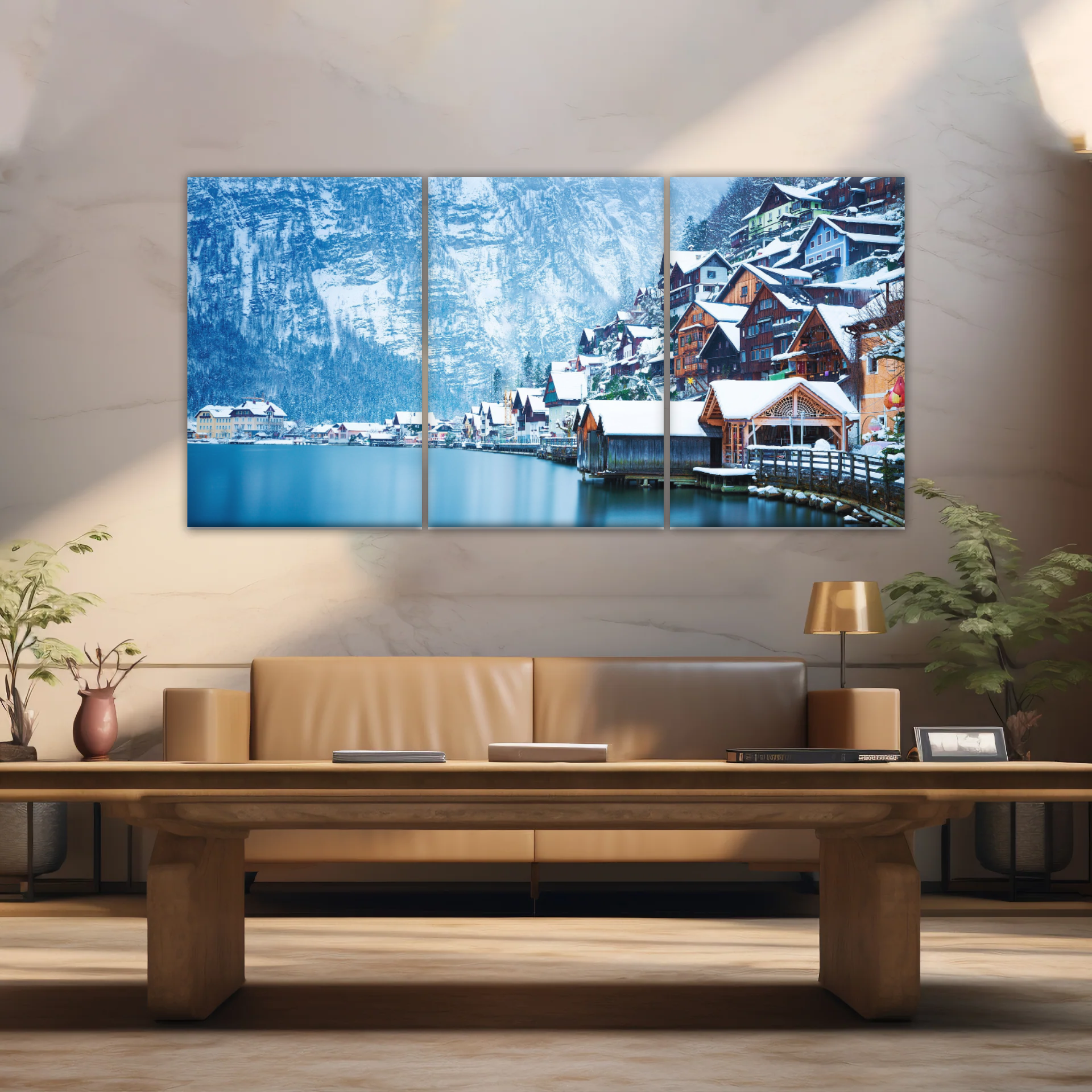 This exquisite wall art creating a serene ambiance that radiates the charm of winter. Transport yourself to a picturesque winter wonderland where a quaint village rests along a peaceful riverside, nestled beneath the majestic snow-capped mountains.
