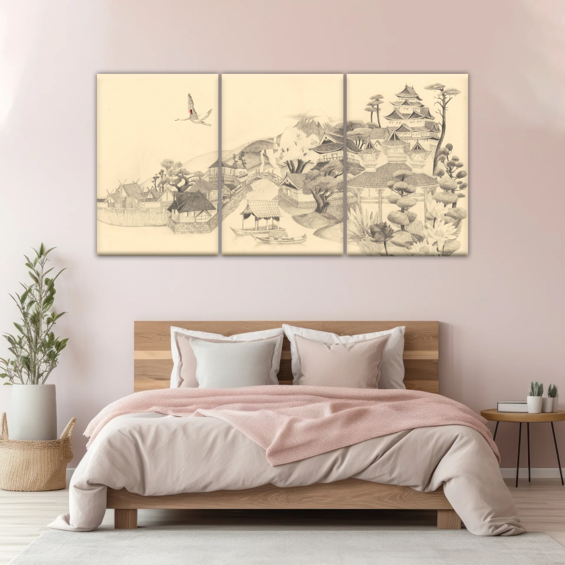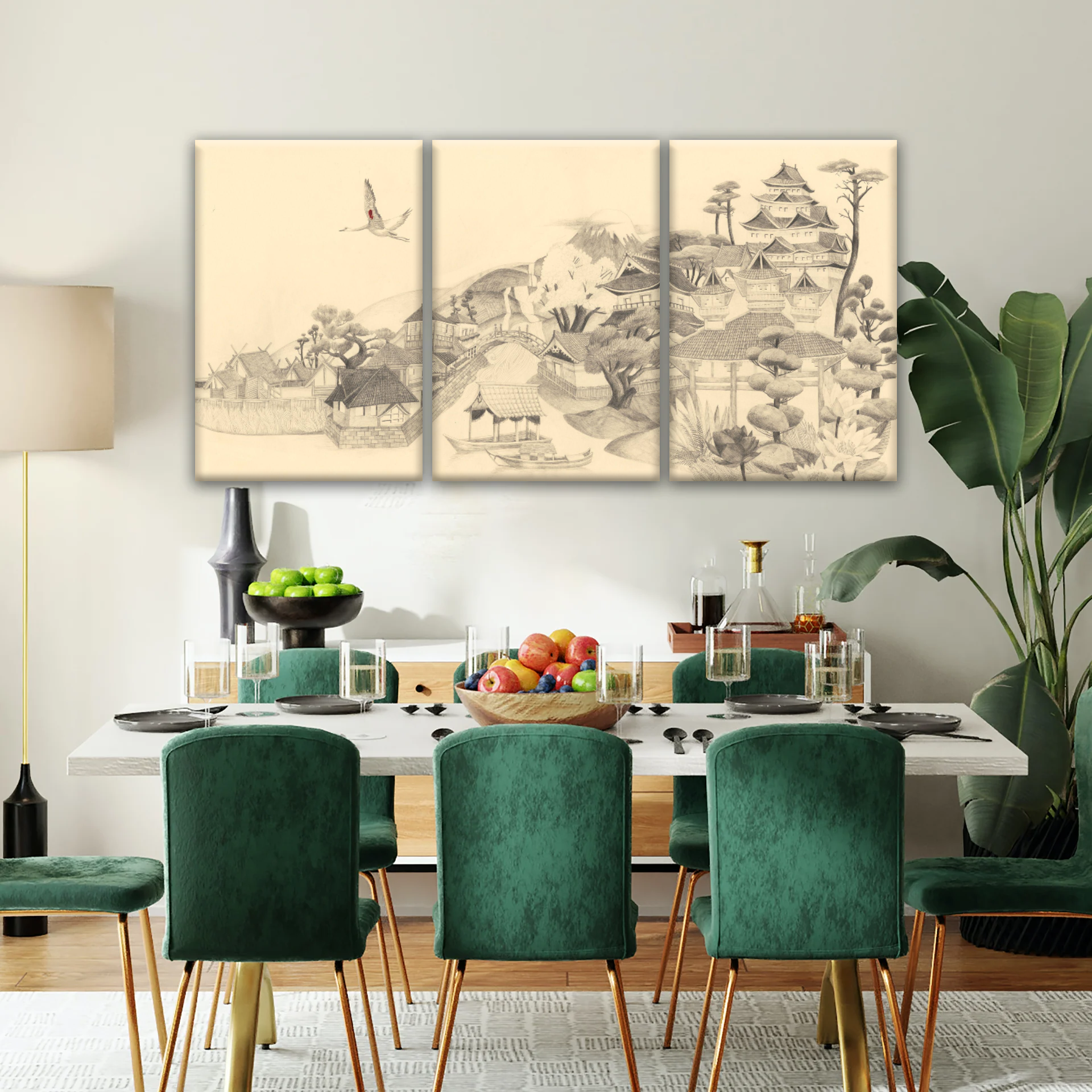 This captivating artwork depicts traditional houses, a pagoda, and lush trees set against a backdrop of majestic mountains, perfect for bringing a touch of tranquil Eastern charm into your space.