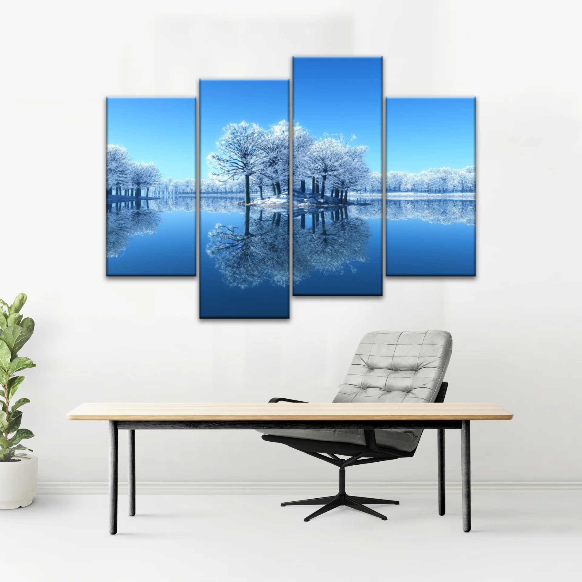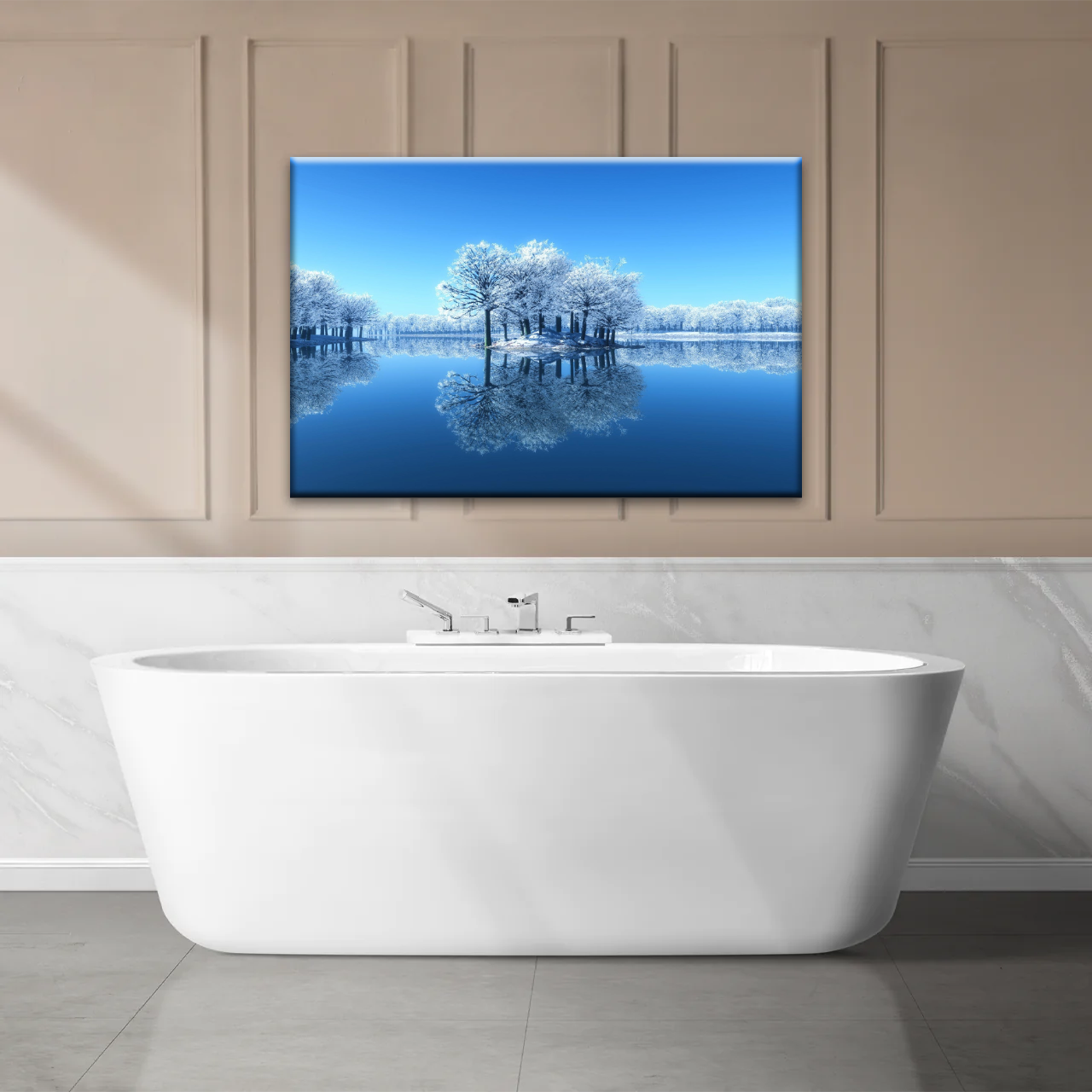 This wall art showcases a beauty snowy landscape, featuring majestic trees blanketed in pristine white snow against the backdrop of a serene lake. The serene and wintry scene creates a calming and picturesque ambiance, making it a perfect addition to any home decor.