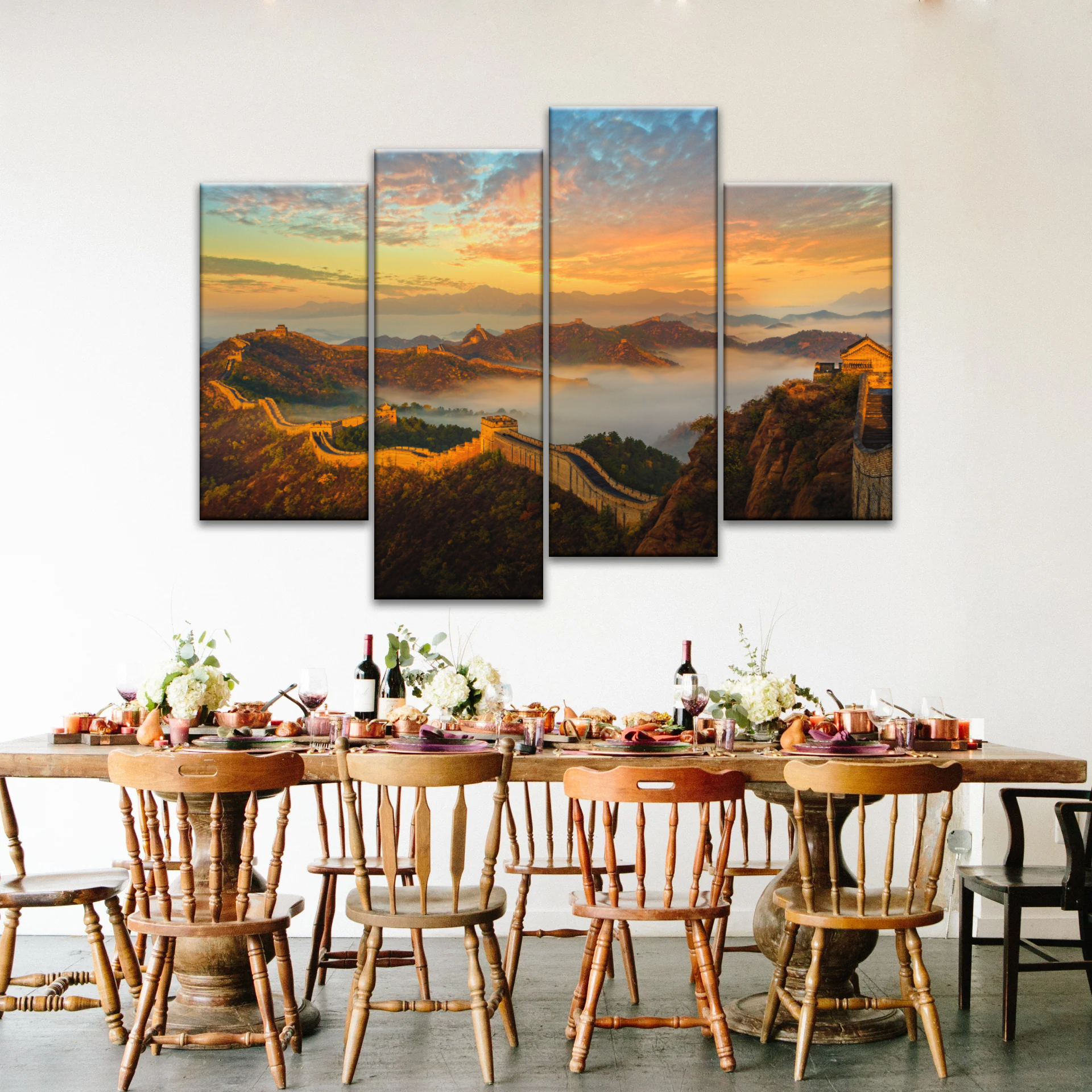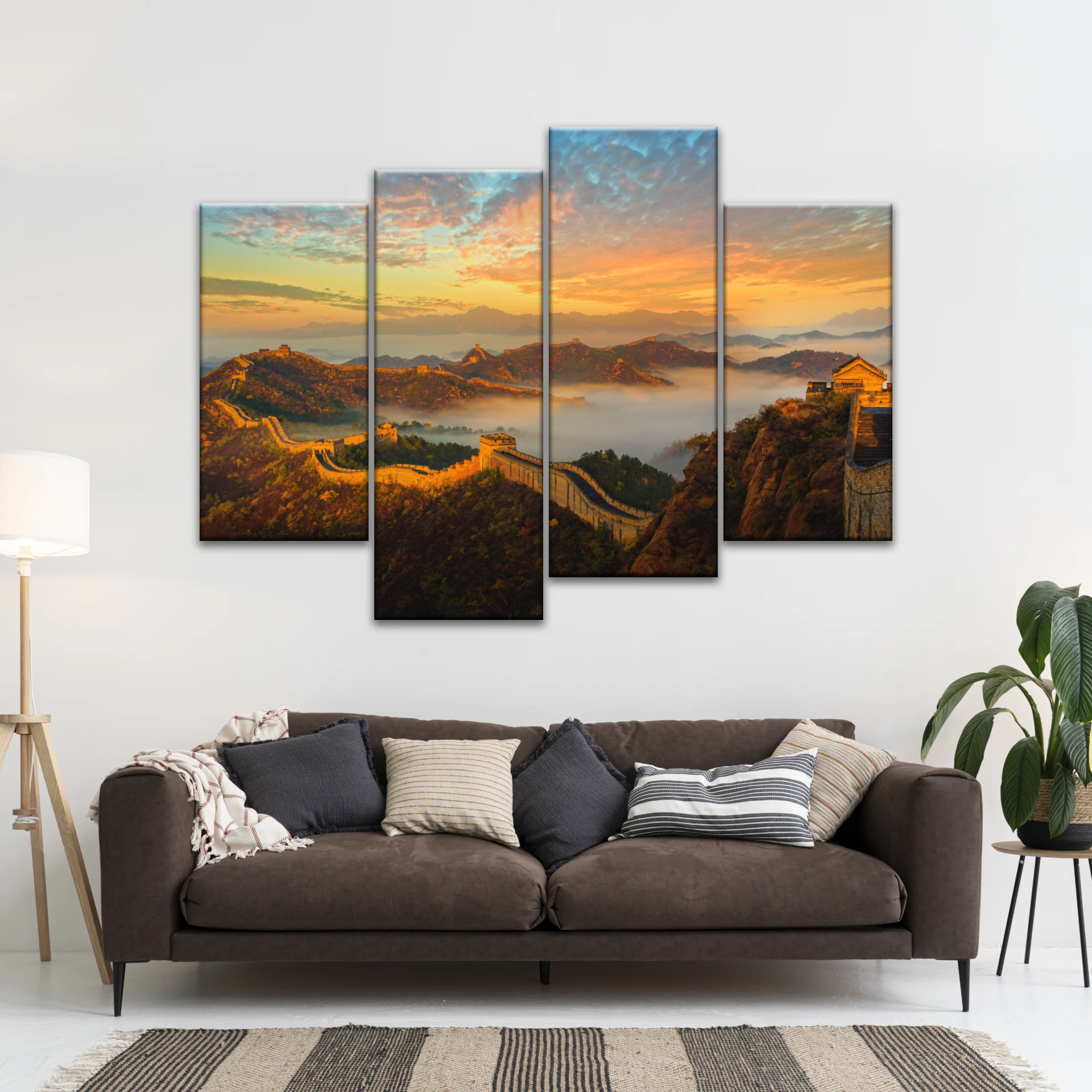 This piece of wall art brings the essence of Chinese history and natural splendor to your living space. It shows us a breathtaking beauty scene - the first rays of dawn illuminate the majestic Great Wall, casting a golden glow over the ancient stones.