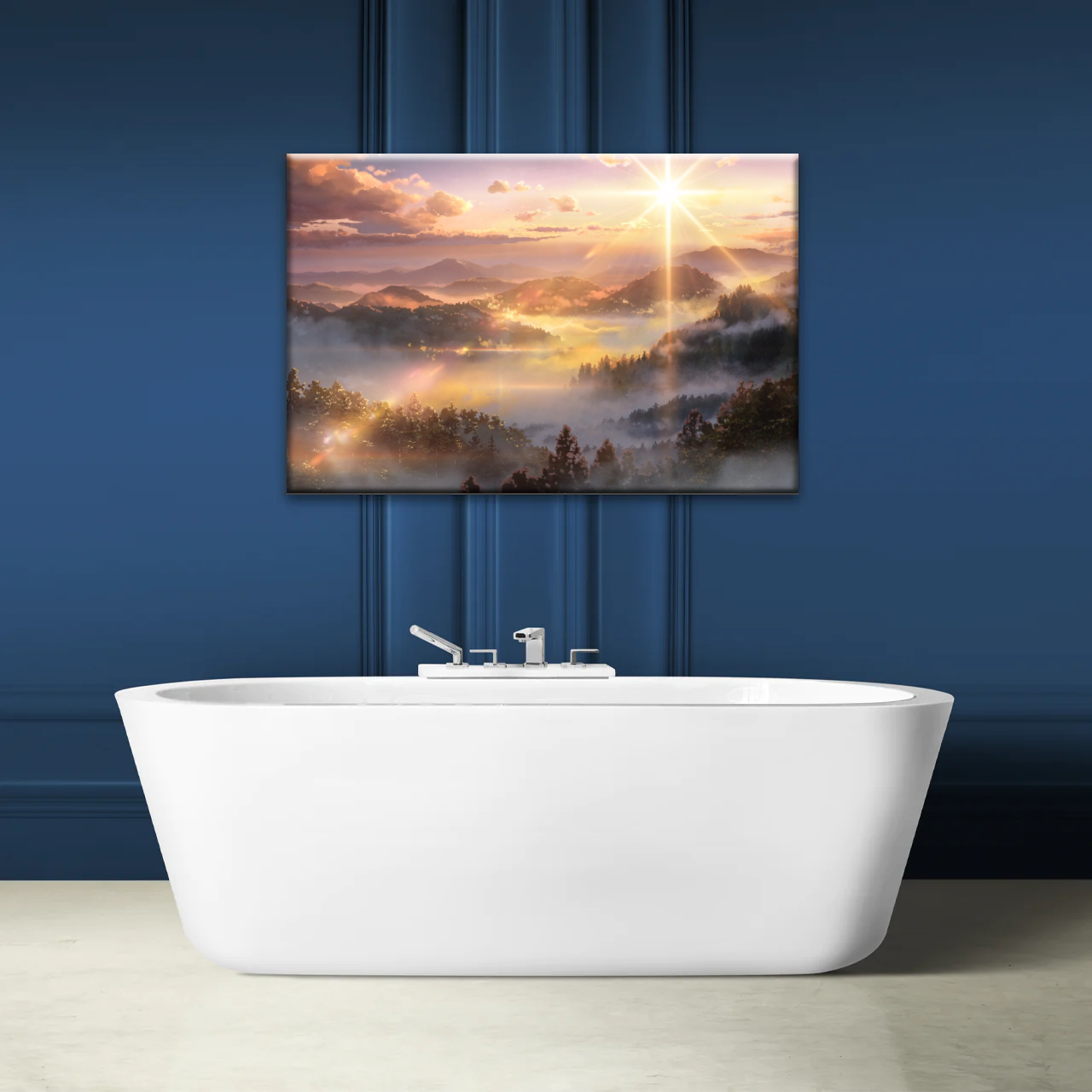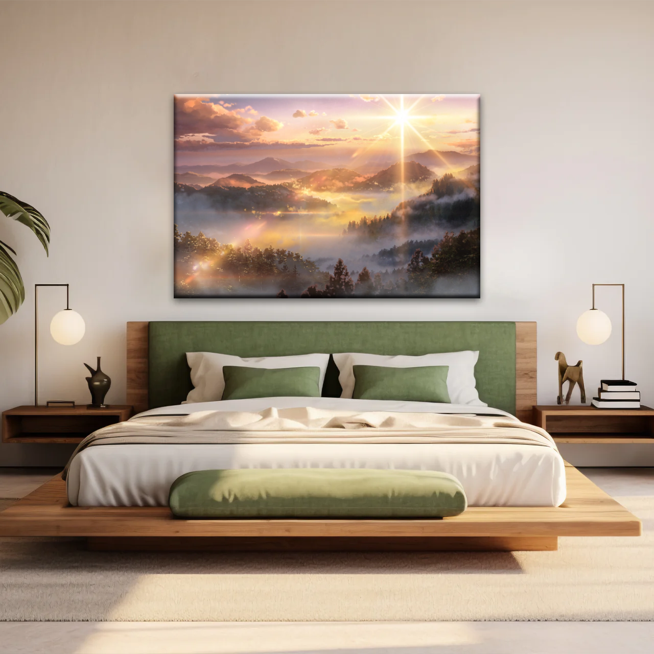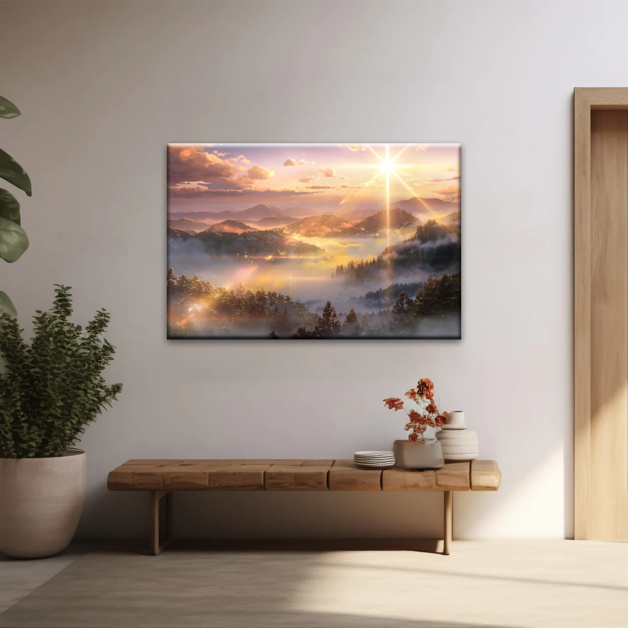 This piece of wall art presented to us the serenity of nature as the first light of dawn bathes the forest in a warm and golden glow, the lush greenery of the forest coming to life under the sunrise morning sky.