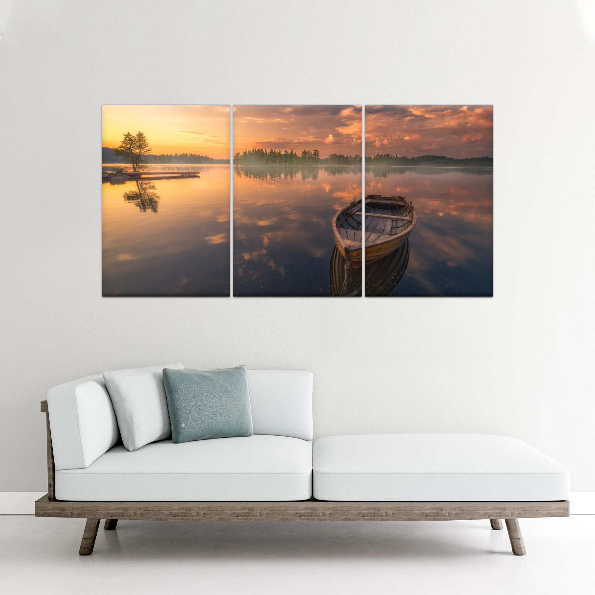 Sunset Reflection Boat In Peaceful Lake Ringerike Norway Picture Canvas Prints