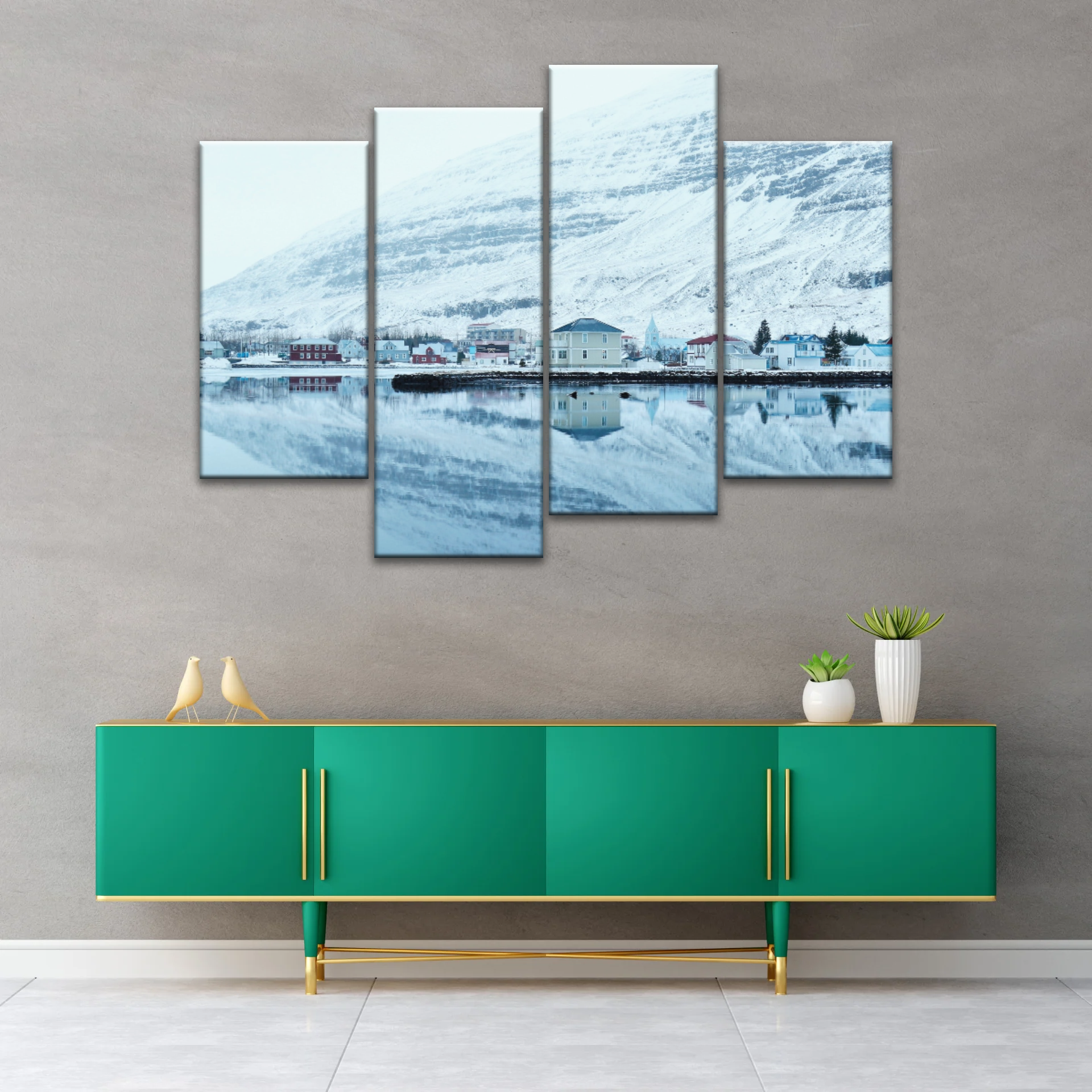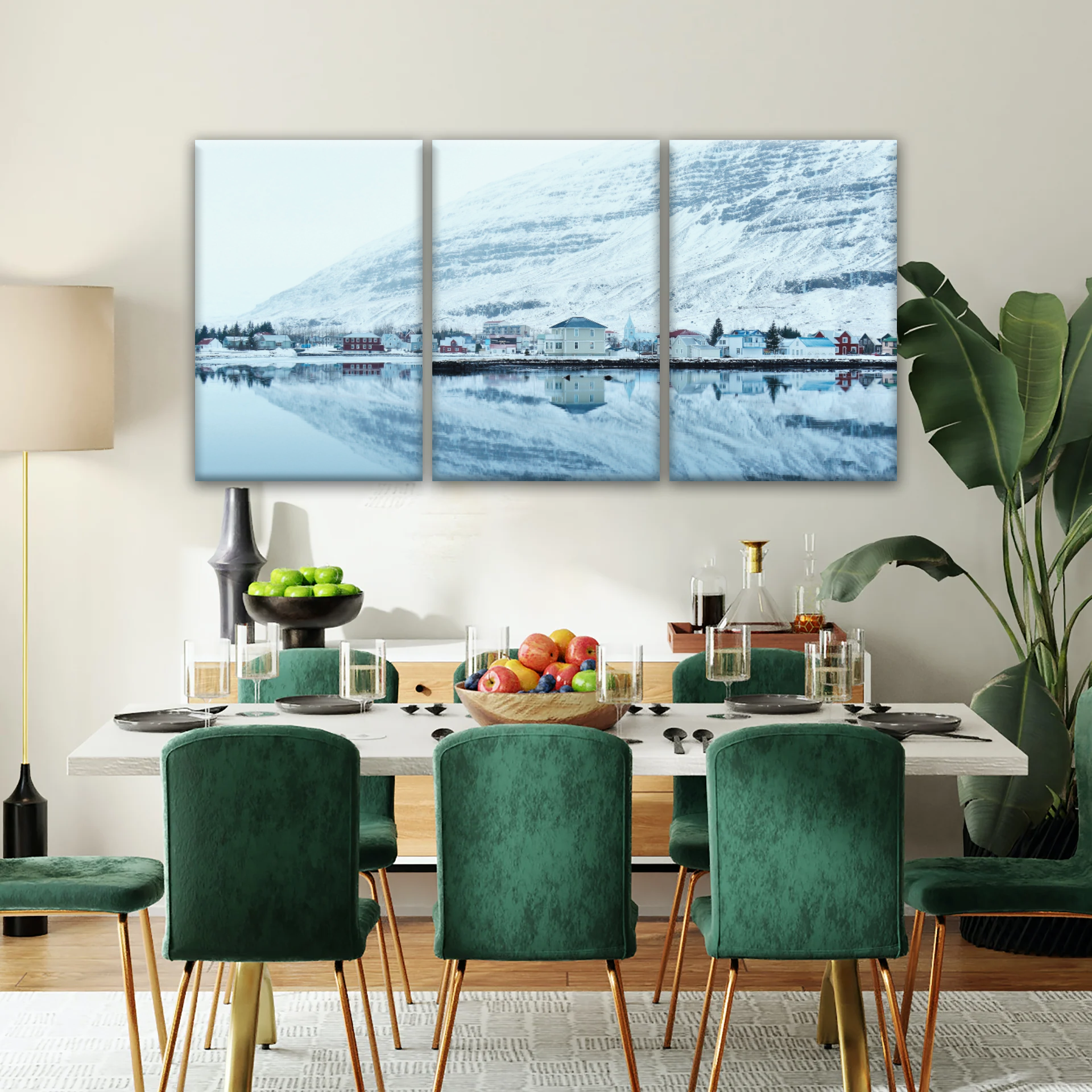 This enchanting masterpiece transports you to a tranquil winter panorama, where an endearing village nestled beside a winding river is embraced by majestic mountains adorned with snow-kissed peaks. Welcome the allure of nature's winter spectacle with every gaze.