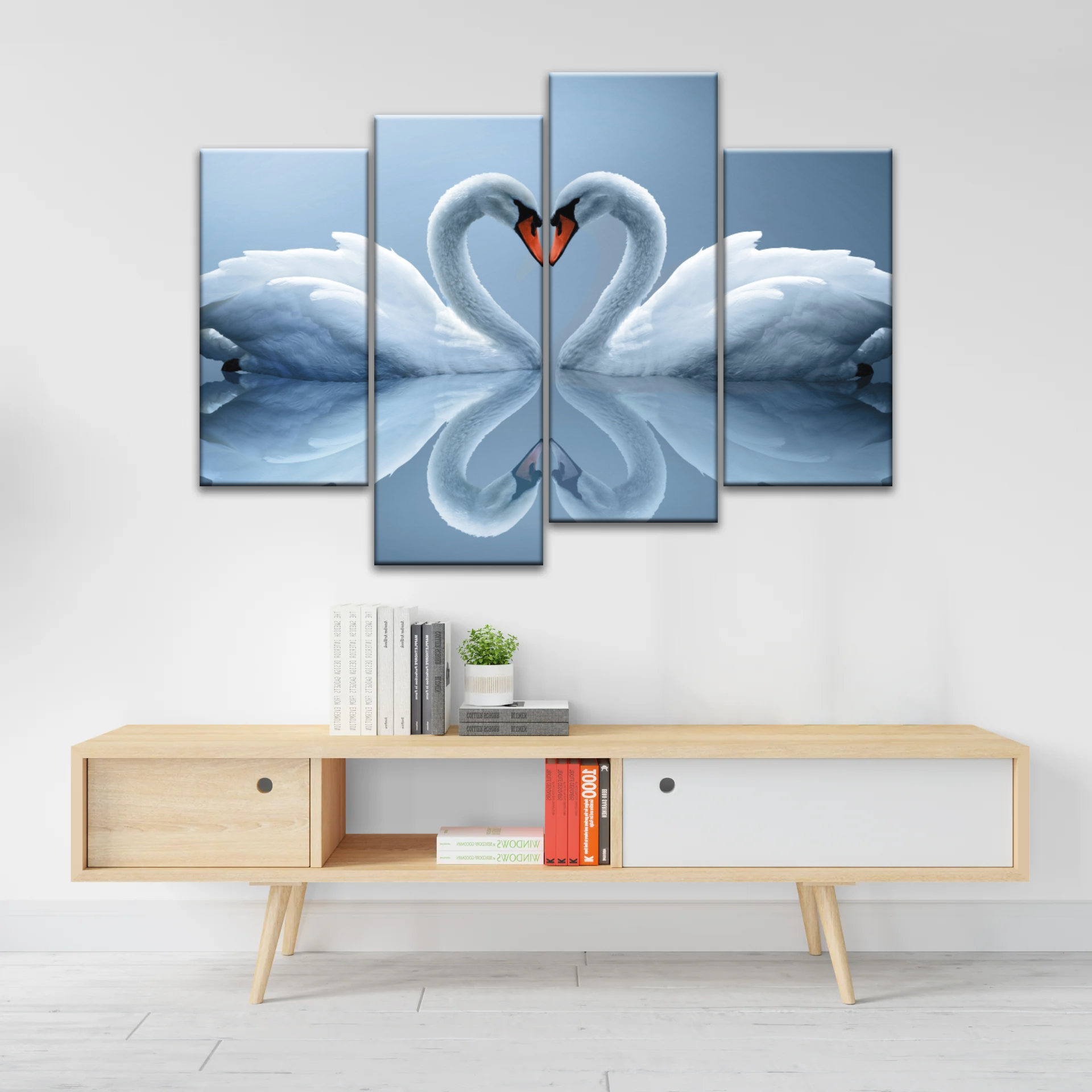 This captivating artwork depicts a graceful pair of swans forming a heart shape, the soft hues and intricate details of the swans create a serene and romantic atmosphere, symbolizing love, unity, and eternal devotion.